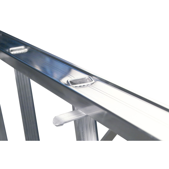 Gefertigt aus hochfestem Aluminium-Strangpressprofil, sind die Holme und Sprossen durchgesteckt und verbördelt. Die Holmgröße beträgt 60 mm. Entspricht der DIN EN 131 und TRBS für Verkehrswege.